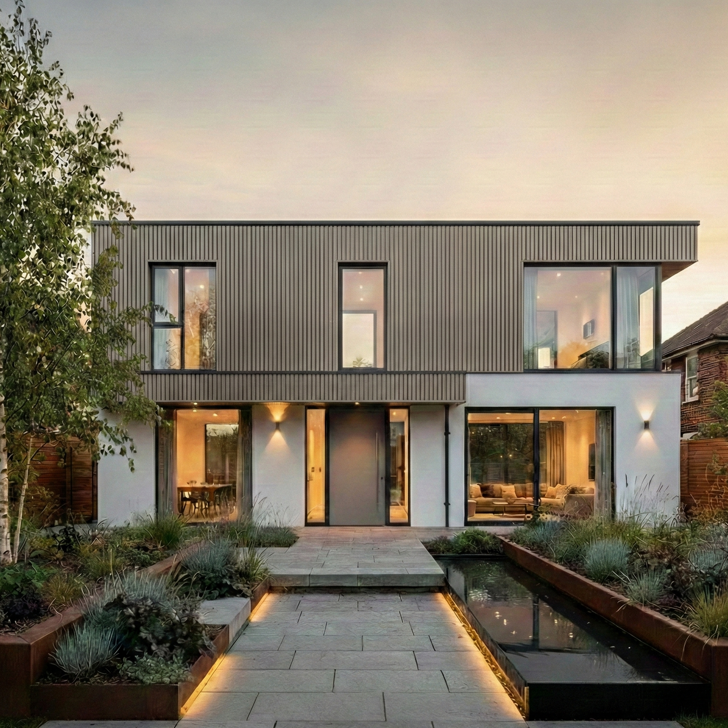 Rear view of Victorian home with single-story extension featuring large bifold doors Version 1 - Side angle with contemporary garden
